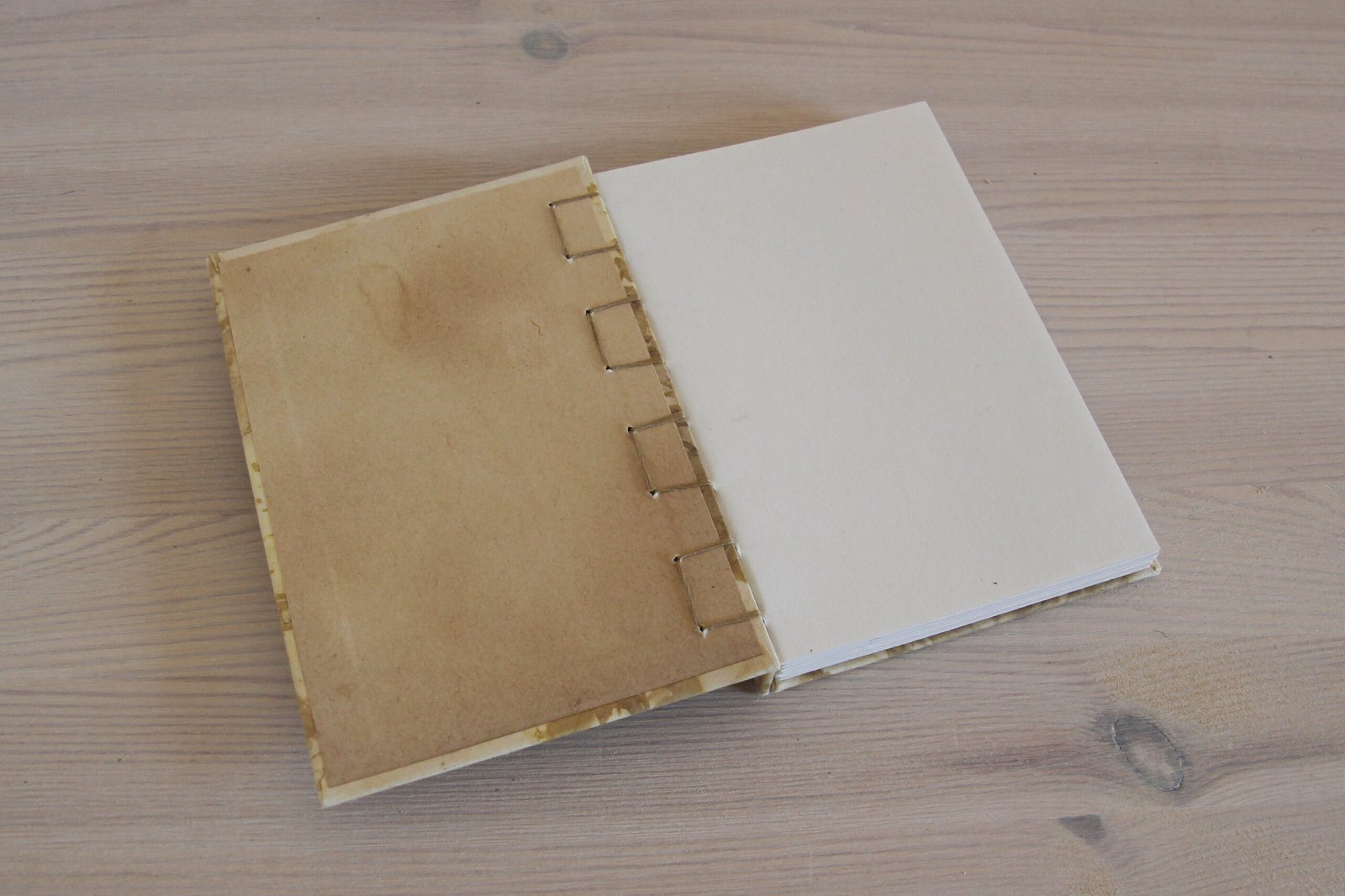 The book has been handbound using the criss cross or Secret/Hidden Belgian binding method, which allows for exposed decorative stitchwork on the outside, a hard spine to protect the paper inside, and opens flat for easy use. The hardcover is made up of three pieces which are then bound together. The cover has been bound with waxed embroidery floss. The inside pages have been bound with white waxed linen thread.
